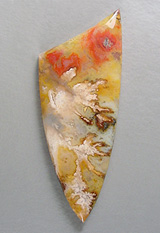 Offered here is a classically gorgeous cabochon of regency rose plume agate, from the famous digs in eastern Oregon. This one was cut from some old stock I put aside long ago, and only recently sliced into. And what a surprise it was inside, I love this stuff! This beauty features several pastel pink plumes that contrast strongly against a background of translucent golden butterscotch agate. The crimson spots add even more color, and the dark reddish brown fringe really sets off the plumes. There's also a scattering of marcasite here and there, adding its shiny metallic gleam, and some tiny drusy pockets. This fine stone will be a joy to work with, no matter how simple or ornate the setting! The cab has a low rounded dome of about 4mm, a crisp designer 'shape, and a super glassy polish both front and back.