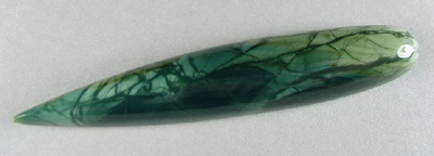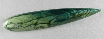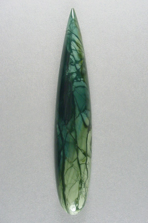 Here is a large deluxe cabochon of PRIMO Imperial jasper, from Mexico. This is easily some of the finest of this wonderful species of porcelain jasper that I've ever had offered. It has a unique pattern of light and dark avocado greens, with some areas showing a teal blue tint. Even though this is a fairly thick cab, there is a degree of translucence to it, and it has character to spare. Set this one in either silver or gold, and you absolutely cannot miss! The stone has a very high rounded dome of nearly 8mm, a sleek symmetrical shape, and a perfect liquid polish both front and back.