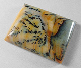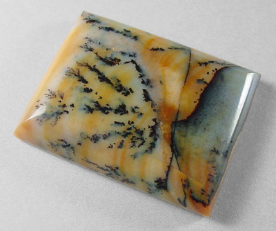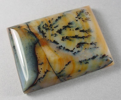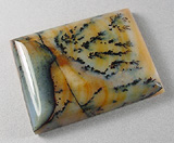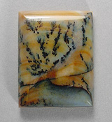 Offered here is a rather scenic cabochon of Paiute agate, cut from old stock material sent to me by a friend in Southern Oregon. (No wonder they've started harvesting this fine agate again, hooray! I hope they dig up some more good stuff!) This well marked example features a bunch of the classic black dendrites swirled into a background of burnt orange, including lighter colored agate with a pale purplish tint. The stone has a high rounded dome of 6+mm, a crisp rectangular shape, with a slick, glassy polish both front and back.
