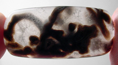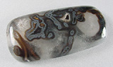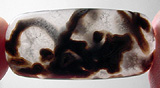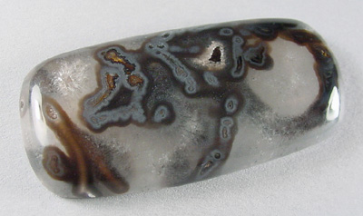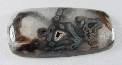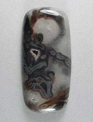 Offered here is a remarkable cabochon of black tube agate, combined with crystalline quartz, something you certainly won't see often. This unique stone features some of the most amazing tube structures I've ever seen, in very interesting colors too. There's neat gun-metal gray lace, edged with root beer brown or black, and the translucent 'crushed ice' quartz both reveals and hides the tubes in a most attractive way. A close look reveals that there's quite a lot going on in this example, including tubes that wind all around, lacy eyes, and several druzy areas, some of which are open, while others are within the stone. One tube is actually hollow, and you can see its small opening at the bottom of the main photo. Very KEWL!! The stone has a high rounded dome of 6+mm, a rectagular 'pillow' designer shape, and despite a scattering of typical teensy pinpoint voids, it has a fine glassy polish both front and back.