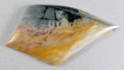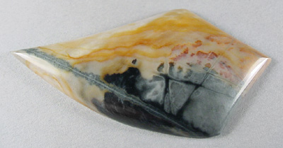 Offered here is a colorfully bold cabochon of high grade Picasso jasper, from Utah. This is the same material that is sometimes also called Picasso stone or Picasso marble. Whatever you prefer to call it, I like it a lot, and think it is very well named indeed; it makes for delightfully unique and artistic stones. This cab features an interesting pattern in fiery orange, cream, gray, rusty red, and jet black, and appears almost scenic in the second photo. It's sure to make a treasured item of jewelry, whatever you might have in mind. The stone has a nicely rounded dome, a versatile designer shape, and a super glossy polish both front and back.