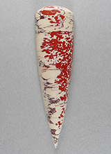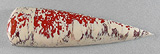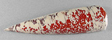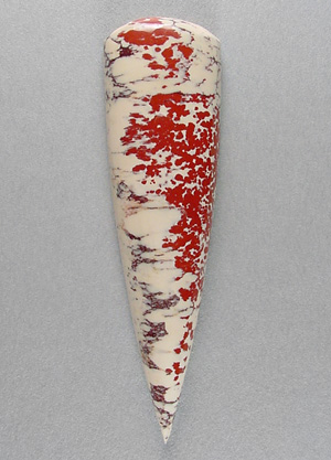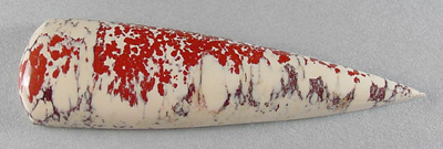 Offered here is a cabochon of top notch alunite, old time stock dug near Quartzite, Arizona. This material is a pleasure to work with when it's this pretty, and I must say it's the nicest I've seen yet. The cab features an attractive pattern of blood red dots and spiderwebs of maroon on a background of old ivory and creamy white. It's sure to look terrific set in either gold or silver jewelry, and it's unusual and not often seen, so let yourself have a little fun with it! The stone has a nicely rounded dome of 6mm, a sleek designer shape, and a super slick polish both front and back.