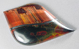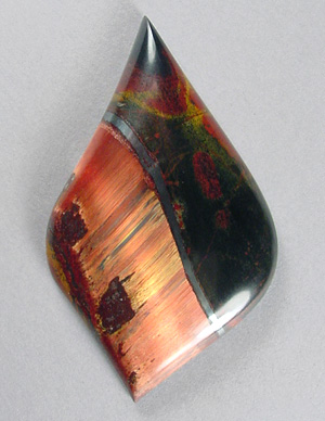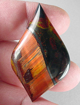 Offered here is an amazing cabochon of rare Marra Mamba tigereye, from Australia. This startling material is brilliantly chatoyant, with a bright rolling flash you just can't miss, even in these flat digital photos. It is predominantly a fiery copper-red, the most highly prized of all the colors, but there are also areas of gold, and even a streak or two of blue. Only the top quality Marra Mamba tigereye possesses this vibrant electric gleam in these outrageous colors. Adding to the appealing composition, there's midnight blue, red, and yellow jasper at one side, separated from the tigereye by a ribbon of shiny metallic hematite. This gorgeous example is one anybody would treasure, a real keeper! It has a nicely rounded dome of nearly 6mm, and an excellent glassy polish both front and back. It's a deal at just over $3 per carat!
