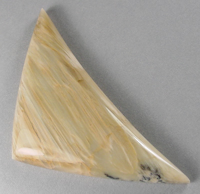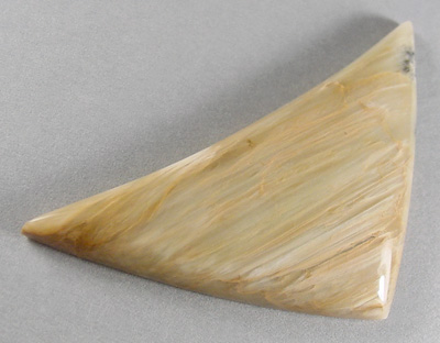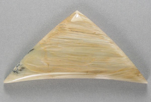 Offered here is an extraordinary cabochon of tigereye, cut from old stock material which hails from California. This example has subtle but silky chatoyance that seems to come and go, in a pattern of streaks across the stone. The colors are earthy shades of tan and cream, as well as some 'almost dendrites' in black. The cab has a well rounded dome of just under 5.5mm, an triangular designer 'chevron' shape, polished to a glassy brilliance both front and back.