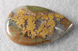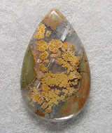 Here is a lovely cabochon of rare Priday plume agate, from the Priday Ranch digs in Oregon. This stone was cut from some grand old stock which had been stashed away for decades in the cherished collection of an old gentleman rockhound. The busy golden orange plumes are classically ornate, adrift in the pool of their agate 'window', framed by a bit of the rust and avocado matrix. There's also a streak of white called a water-level band, which was horizontal when the thunderegg formed. The cab has a low but well-rounded dome, a sweet teardrop shape, nicely polished both front and back.