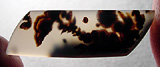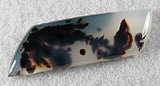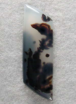 Offered here is a unique cabochon of Jenny Creek dendritic agate, cut from the heart of a nodule collected many years ago. I'm fairly sure this collectibly rare agate is also known by the name of Copco agate, found in southern Oregon near the California border; sadly, no more collecting is permitted. This splendid example features an outstanding show of dark dendrites in translucent milky agate, similar to Montana moss agate. While shaping this stone, the pattern appeared to me to resemble a long necked bird-like dinosaur hatchling just bursting from its egg, but Rain claims she sees a weird flower waving on its leafy stalk... go figure! Whatever you see (or don't see), this one's a beauty by anyone's lights! It has a low but nicely rounded dome of 5mm, a sleek designer trapezoid shape, and a fine glassy polish both front and back.