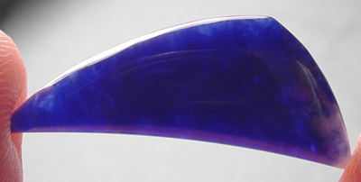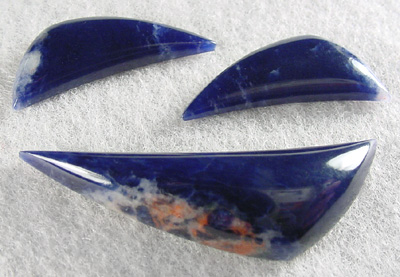 Offered here is a matching trio of designer cabochons of Namibian sodalite, relatively new material that I like a lot. These stones feature deep, rich royal blue, with wisps of white; the large one also has some streaks of orange. Sodalite has sometimes been refered to as 'the poorman's lapis', due to the similarity in color. But this gemmy sodalite has a nice degree of translucence lapis lazuli cannot claim, and believe me when I tell you it looks absolutely stunning with cobalt blue beads! The stones have nicely rounded domes proportionate to their size, polished both front and back.
