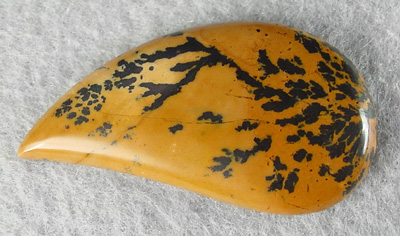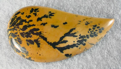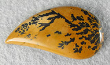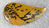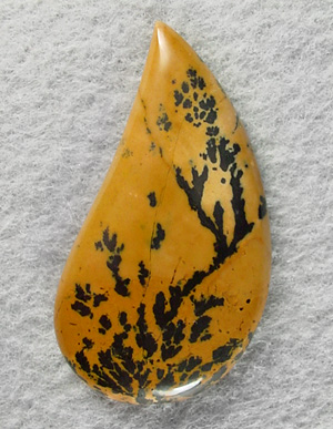 Here is a fine cabochon of dendritic mosquito jasper, from Wyoming. This fancy example has extra nice dendrites that resemble jet black trees and bushes, contrasting wonderfully against a rich earthy yellow orange background. Just in case, I'd like to mention that there are no cracks or fractures present, the meandering threads are all part of the unique pattern. The cab has a well rounded dome of 5+mm, a graceful designer 'paisley' shape, and a fine glossy polish both front and back.