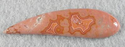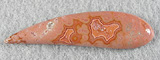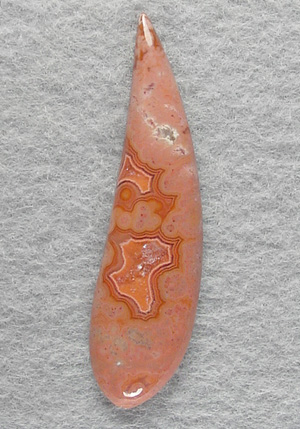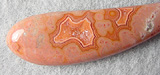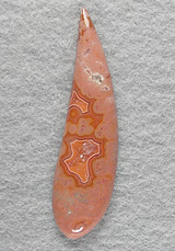 Offered here is a lovely cabochon of collectible Dryhead agate, from Montana. This subtle but well patterned beauty features some neat fortification banding in hues of orange on coral pink, both of which frame a sparkling crystalline core. I should mention that there are some tiny voids in the larger crytal 'heart', but that adds rather than detracts from this unique gemstone. The cab has a nicely rounded dome, a gracefully fluid designer 'paisley' shape, and a smooth glassy polish both front and back.