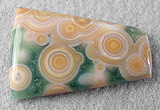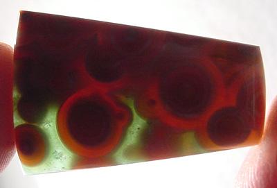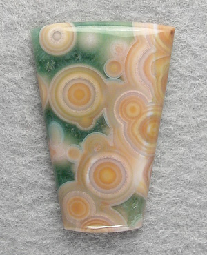 Offered here is a striking ocean jasper cab. This Madagascar native is is literally mined in the ocean waters near the shore, and it's become such a favorite over the years that I'm about ready to swim over there and find my own! This one's of the more agatey variety, showing an appealing translucence, especially in the green gel areas. It's beautifully patterned with ornate bullseyes of various sizes, in pastels of peach, pink and cream, accented with a touch of avocado. It'll make a delicious item of jewelry, almost effortlessly! The cab has a low but well rounded dome, and despite some negligible pits in the crystalline green, it's perfectly polished both front and back.