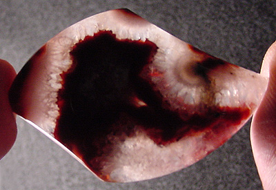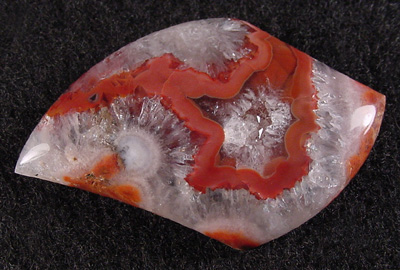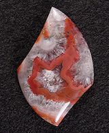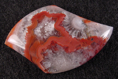 Offered here is a cabochon of puma agate, from Mendoza province, north of Patagonia. Puma agate is a relatively new addition to my lapidary studio, and this is not only the very first cab I've offered, it's the first I've yet seen. What few nodules have been offered quickly became instantly collectible. I think this example is absolutely fascinating, with an almost star shaped ribbon of soft dark red against a background of macro-crystallized quartz. It's full of pretty sparkles, like crushed ice, and does kind of remind one of snow cones. A close look reveals some pseudomorphs, and no doubt those puffy whitish pom poms are sagenitic balls. I should mention that there is some slight feathering here and there, but they're well healed, and the stone is quite solid and stable. It has a high and well rounded dome, a curvy designer shape, and a fine glassy polish both front and back.