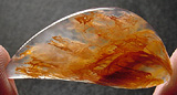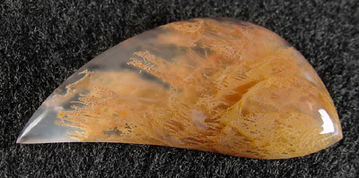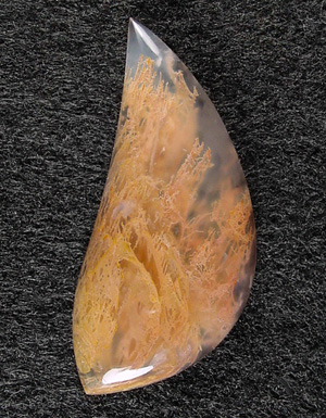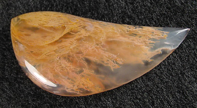 Offered here is a large, deluxe cabochon of rare Horse Canyon agate, from California. This most famous type of moss agate is arguably some of the prettiest and rarest there is. Sadly, the area where it comes from is all private and closed, so there's been no collecting for quite some time now. This unique cab features the classic characteristics of mossy tendrils, but instead of the more typical greens, it's pastels of apricot and orange. The delicate lacy filaments stand out wonderfully in a highly translucent agate base, though the photos fall short of showing the intricate detail, so please click to enlarge the pics for a closer look. This substantial stone has a very high rounded dome of 6+mm, a sweet designer shape, and a fine glassy polish both front and back.