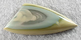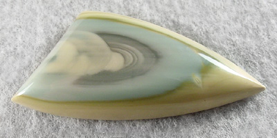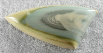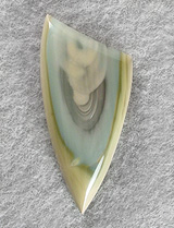 Offered here is an intriguing cabochon of Imperial jasper, from Mexico. This collectible 'ojitos' material is simply wonderful stuff, another member of the fine grained porcelain jasper family I love so much. (Ojitos means little eyes in Spanish.) This one features a neat orbicular pattern with muted blues and greens that reminds me of a Japanese watercolor. The ghostly pattern fits the shape of the stone quite well, and the backside is just as beautiful. The stone has a very high rounded dome of 7+mm, a bold designer shape, and a super glassy polish both front and back.