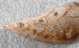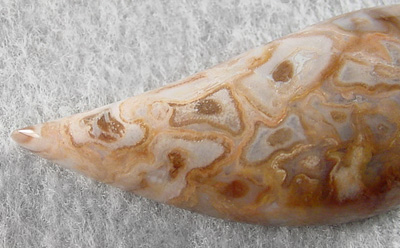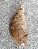 Offered here is a splendid cabochon of rare petrified palm root, from California's Mojave Desert. This fossil material is a joy to work with, showing next to none of the typical fractures petrified wood so often has. The once-living palm's ringed pattern is quite apparent here, with a feast of neat eyes in pastels of orange, brown and palest blue with cream. Some areas do have a bit of translucence too, and as you can see, it's quite different from the more common pet palm from Texas and Lousiana. This one is sure to look grand in most any setting, or as a centerpiece in your collection. The cab has a very high rounded dome of 8mm, a gracefully curved designer shape, and is polished both front and back.