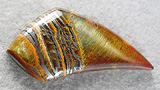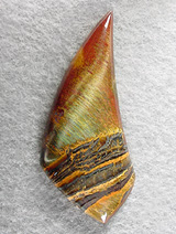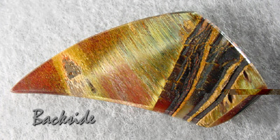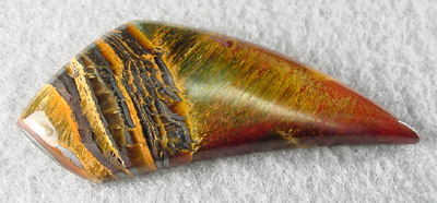 Offered here is an intriguing cabochon of rare Marra Mamba tigereye, from Australia. This very rare material is delightfully colorful, with plenty of chatoyant flash, even in these flat digital photos. This gorgeous example is a genuine treasure, with gold and blue dominated colors found only in the top quality Marra Mamba tigereye. There are ribbons of dark silvery hematite, with bright orange, red and yellow jasper, and translucent quartz adding to its appealing character. The stone has a well rounded dome of 5+mm, and an excellent glassy polish both front and back. I do need to mention that the backside has two smallish pits, but they don't detract from this stone atall. It's a steal at well under $4 per carat!