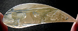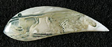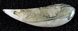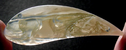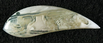 Here is a large and deluxe cabochon of rare Horse Canyon agate, from California. This most famous type of moss agate is arguably some of the prettiest and rarest there is. Sadly, the area where it comes from is all private and closed, so there's been no collecting for quite some years now. This unique cab shows the classic mossy tendrils in palest pastels of pistashio green, afloat in a highly translucent agate base, both snowy white and clear. The pleasantly intricate patterns fit the stone's shape beautifully; please be sure to click the pics up to full size to truly appreciate the artful natural beauty. This substantial stone has a very high rounded dome of 6mm, a sweet designer 'flame' shape, and a brilliant polish both front and back.